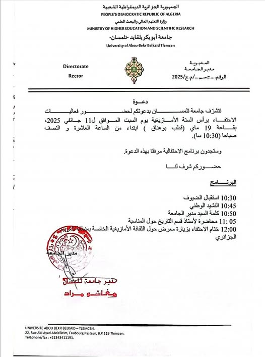 تتشرف جامعة تلمسان بدعوتكم لحضور فعاليات الاحتفاء برأس السنة الأمازيغية يوم السبت الموافق ل