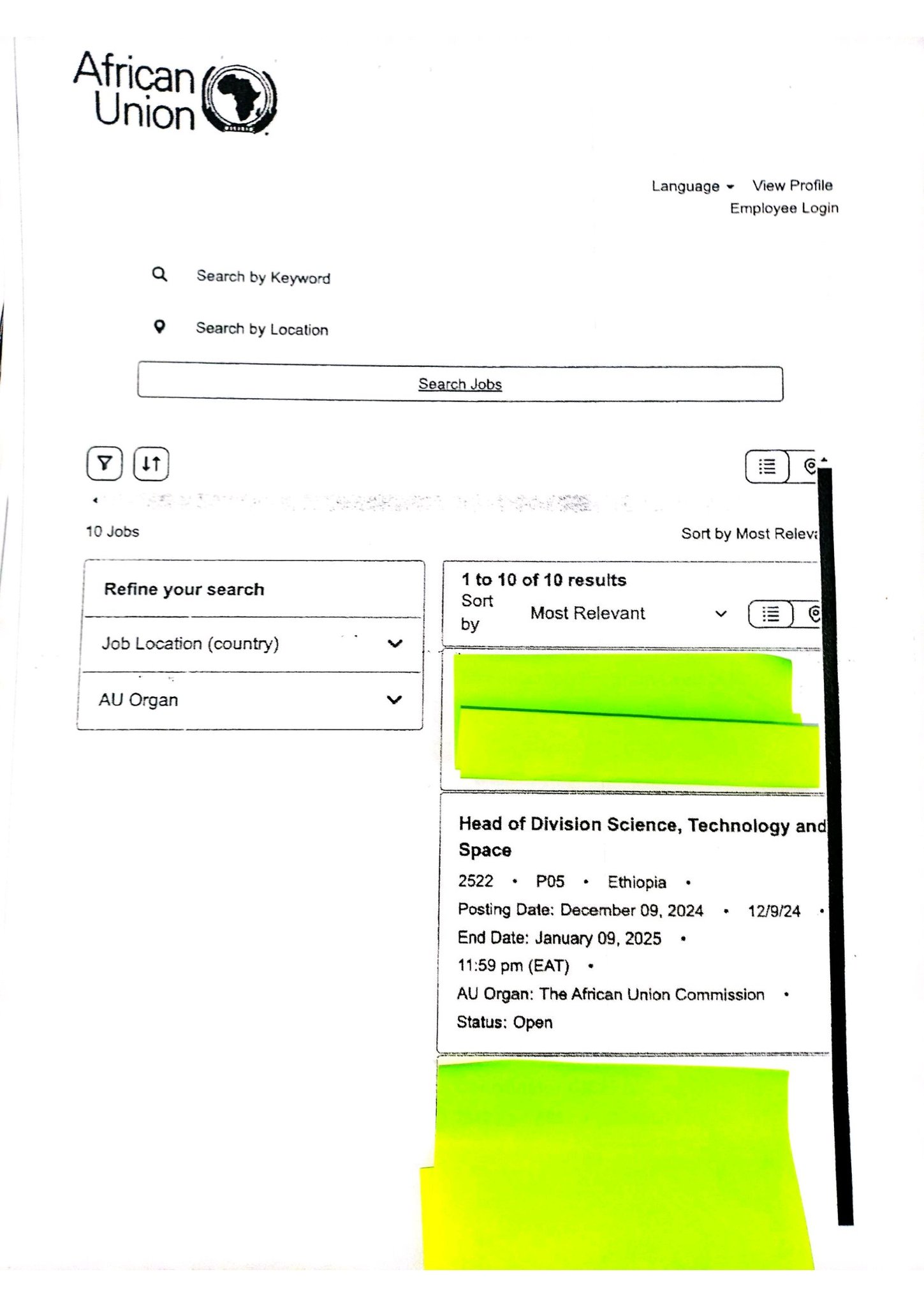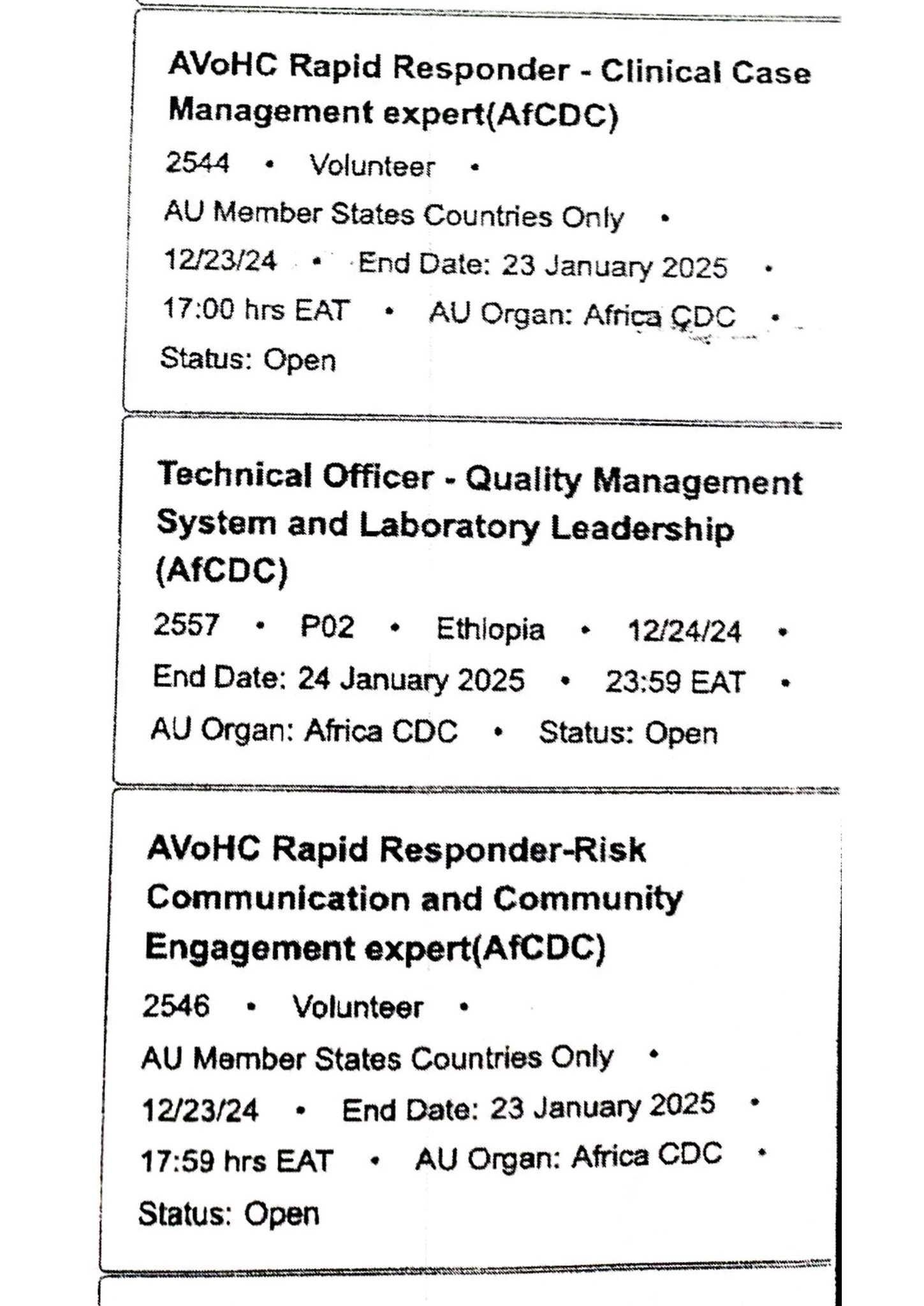 أعلن الاتحاد الإفريقي (UA) مؤخرًا بنشر عدة عروض وظائف داخل مؤسساته، بما في ذلك المركز الإفريقي للسيطرة والوقاية من الأمراض (CDC إفريقيا)، وأمانة منطقة التجارة الحرة القارية الإفريقية (ZLECAf)، ومفوضية الاتحاد الإفريقي.