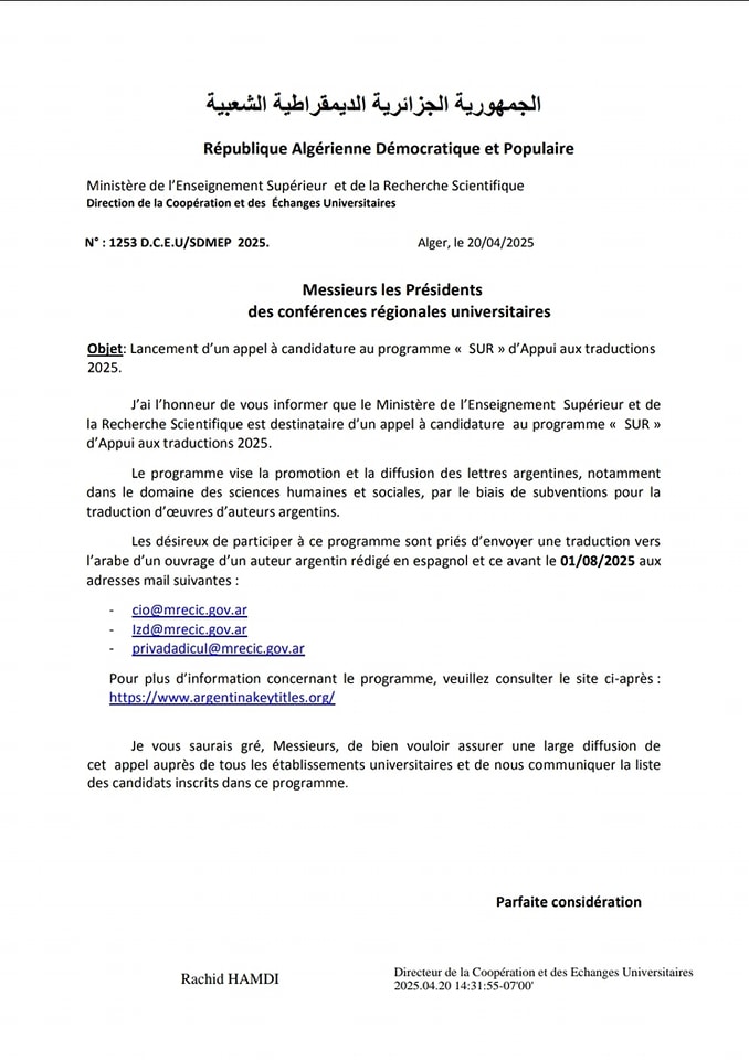 يُدعى الراغبون في المشاركة في هذا البرنامج إلى إرسال ترجمة إلى اللغة العربية لعمل مكتوب بالإسبانية لمؤلف أرجنتيني، وذلك قبل 1 أوت 2025، إلى عناوين البريد الإلكتروني التالية: