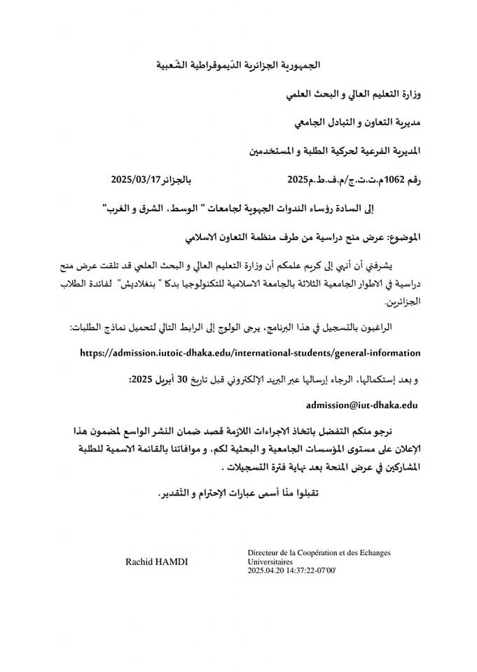 تلقت وزارة التعليم العالي والبحث العلمي عرضًا لمنح دراسية في الأطوار الجامعية الثلاثة بـ الجامعة الإسلامية للتكنولوجيا في دكا – بنغلاديش، لفائدة الطلبة الجزائريين.