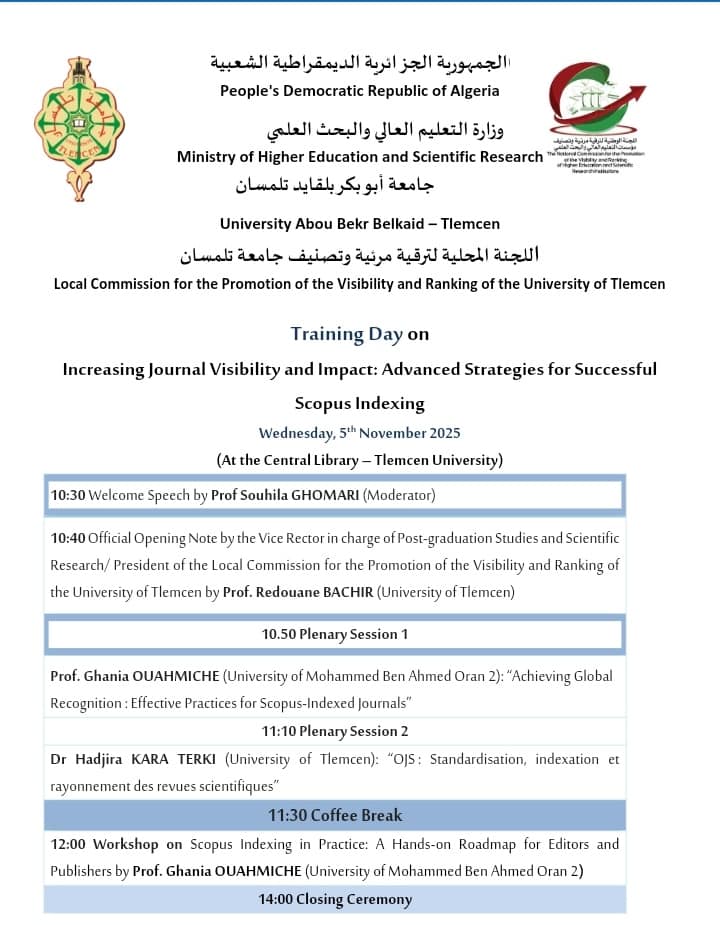 في إطار مرافقة جامعة تلمسان رؤساء تحرير المجلّات العلمية من أجل فهرستها في قواعد المجلات الدولية تنظم اللجنة المحلية لترقية مرئية وتصنيف جامعة تلمسان بالتعاون مع اللجنة المحلية لترقية مرئية وتصنيف جامعة وهران 2 ورشة تكوينية تحت إشراف أ.د. وحميش غنية من جامعة وهران 2 يوم الأربعاء 05 نوفمبر 2025 بالمكتبة المركزية