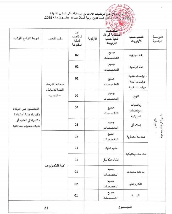 تعلن جامعة أبو بكر بلقايد – تلمسان عن توظيف عن طريق المسابقة على أساس الشهادة، للالتحاق بسلك الأساتذة المساعدين، رتبة أستاذ مساعد، الحائزين على شهادة دكتوراه دولة أو شهادة دكتوراه أو شهادة معترف بمعادلتها، وذلك وفقًا للشعب المبينة في الجدول