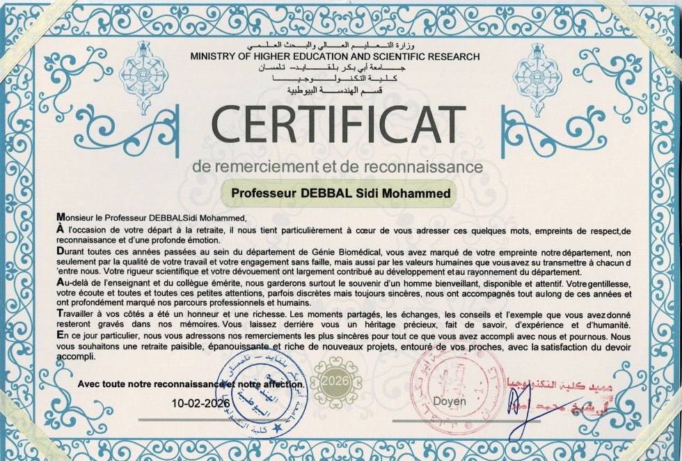 Le Département de Génie Biomédical de la Faculté de Technologie – Université de Tlemcen a organisé, en date 10-02-2026, une cérémonie en l’honneur du Professeur DEBBAL Sidi Mohammed el Amine, à l’occasion de son départ à la retraite, en reconnaissance de son parcours académique et professionnel remarquable au service de l’enseignement supérieur et de la formation des générations.