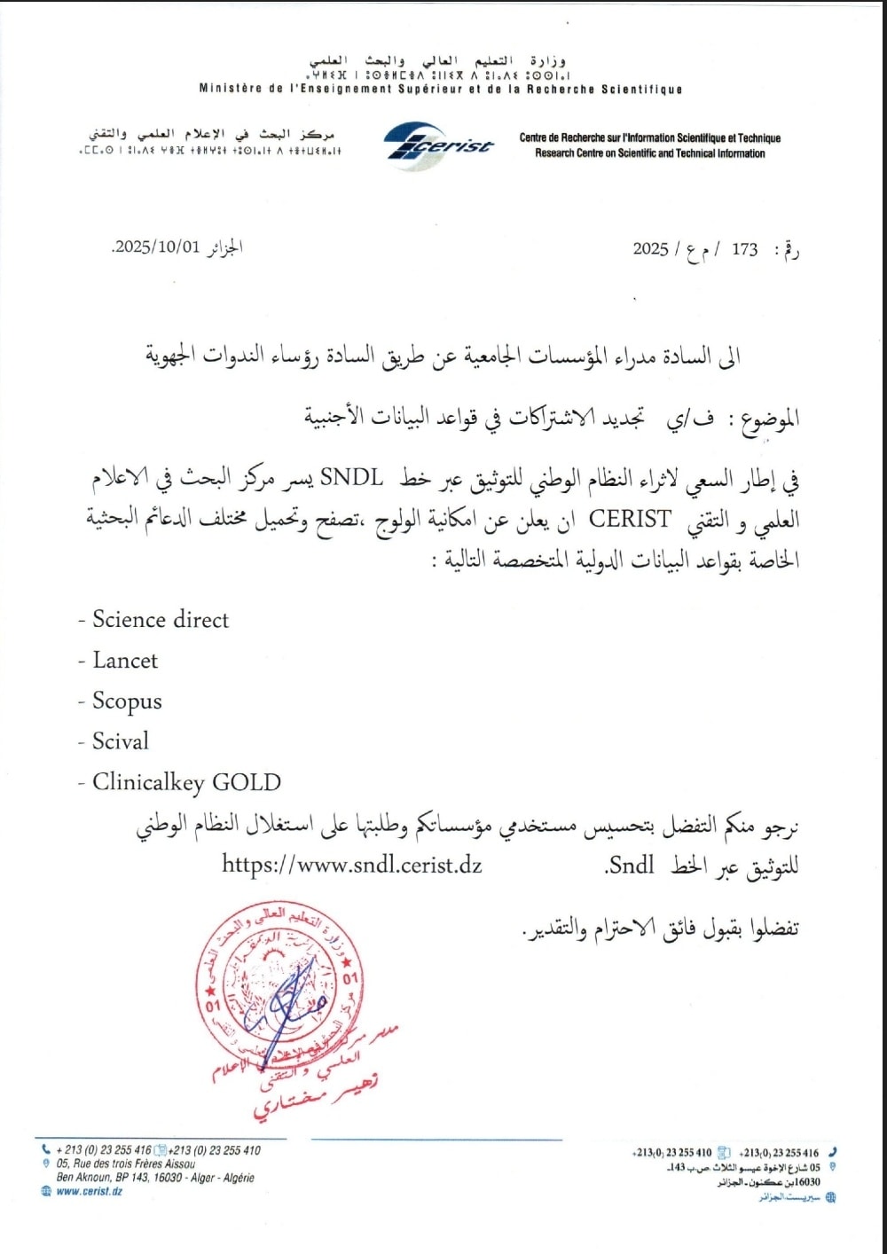 As part of its efforts to support scientific research and expand access to international academic resources, the University of Tlemcen informs all its teacher-researchers, and Master’s and PhD students that access to the National Online Documentation System (SNDL) has been restored, under the supervision of the Research Center on Scientific and Technical Information (CERIST).