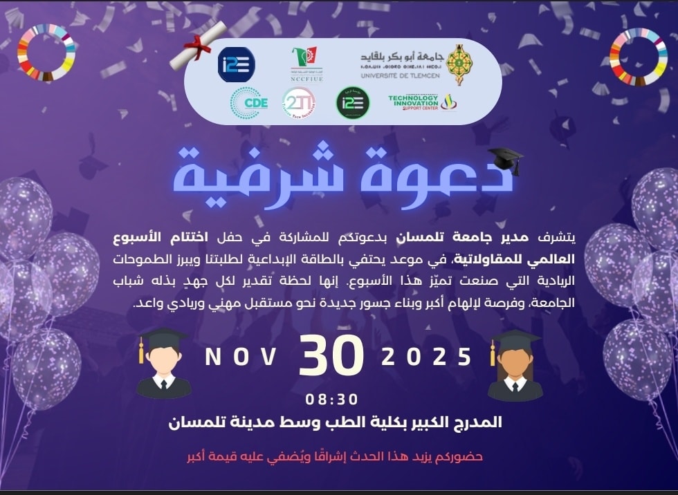 The Rector of the University of Tlemcen, Prof. MEGHACHOU Mourad, is pleased to invite you to the closing ceremony of the Global Entrepreneurship Week.
