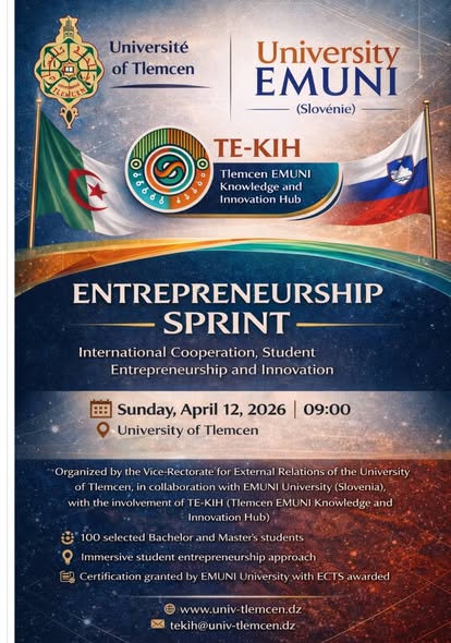 The University of Abou Bekr Belkaid Tlemcen, through the Vice-Rectorate in charge of External Relations, Cooperation, Animation, Communication, and Scientific Events, in collaboration with EMUNI University (Slovenia) and with the involvement of the TE-KIH Center (Tlemcen EMUNI Knowledge and Innovation Hub), is launching a call for applications for students wishing to participate in the following event: