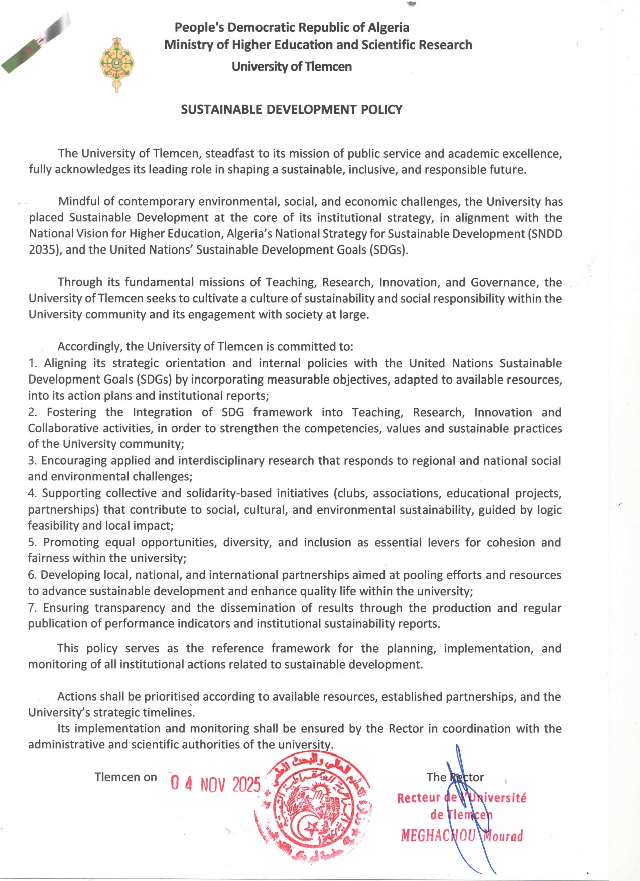 As part of its strategic vision and its commitment to academic excellence and social responsibility, the University of Tlemcen affirms its determination to promote sustainable, inclusive, and responsible development. Through this policy, it integrates the principles of sustainability into its missions of teaching, research, innovation, and governance, thus actively contributing to the achievement of the Sustainable Development Goals (SDGs) and to the continuous improvement of the quality of university life.