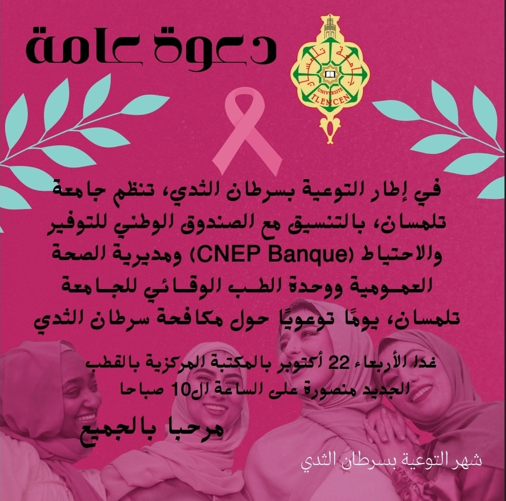 L’Université Abou Bekr Belkaïd de Tlemcen a le plaisir de vous inviter à une journée de sensibilisation dédiée à la lutte contre le cancer du sein, dans le cadre du mois international de sensibilisation à cette maladie.