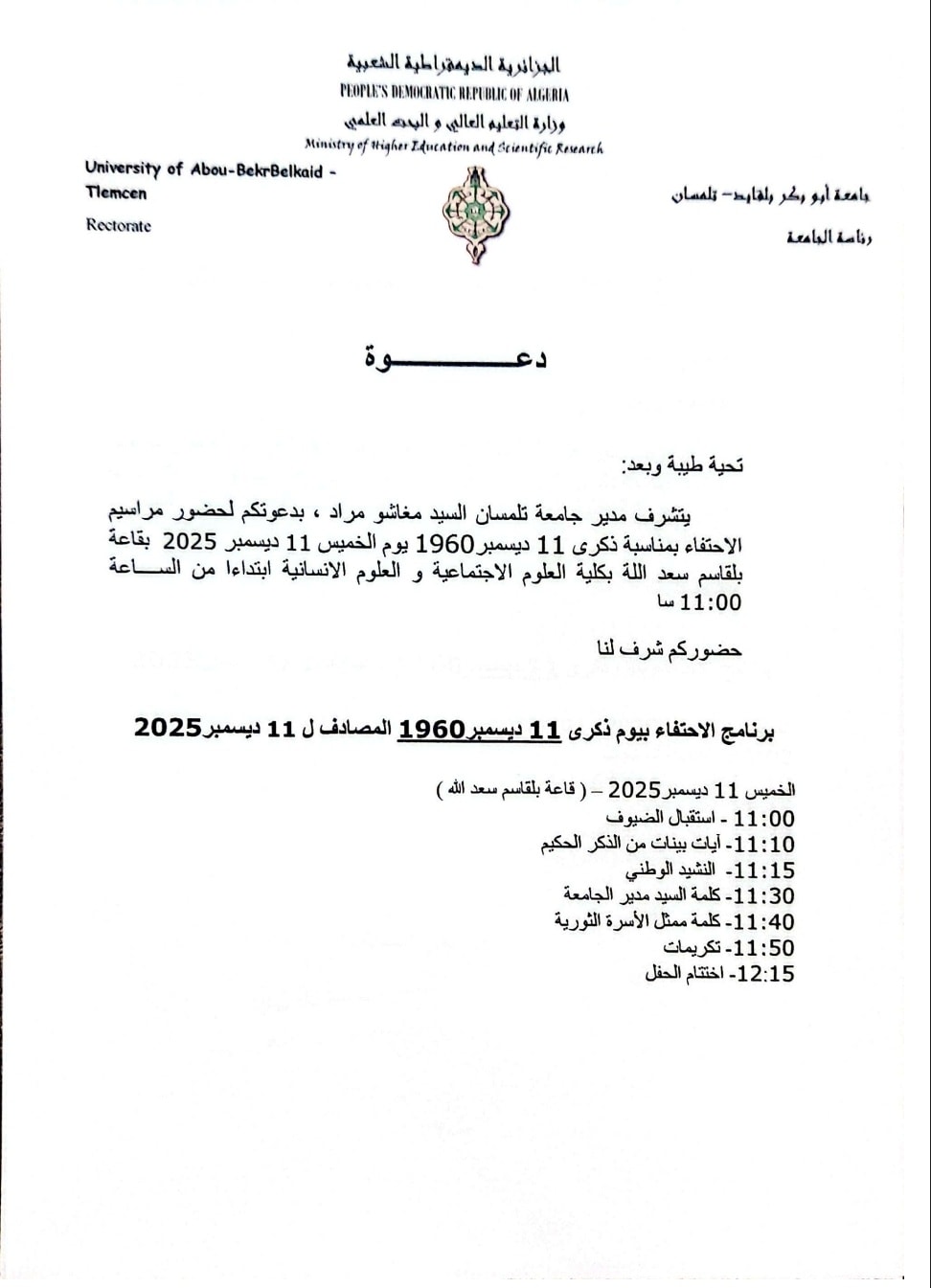 Le recteur de l’Université de Tlemcen, Pr.MEGHACHOU Mourad , a l’honneur de vous inviter à assister aux activités commémoratives de la Journée du 11 décembre 1960.