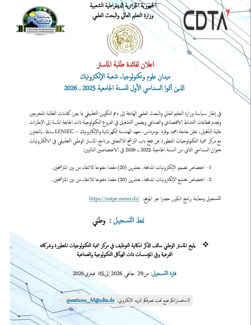 Dans le cadre de la politique du Ministère de l’Enseignement Supérieur et de la Recherche Scientifique, visant à promouvoir la formation pratique et à renforcer les compétences des diplômés en adéquation avec les besoins des secteurs économique et industriel, l’Université de Blida 1 et l’Université de Boumerdès Mohammed Bouguerra, en partenariat avec le Centre de Développement des Technologies Avancées (CDTA), annoncent l’ouverture des candidatures pour l’intégration aux programmes nationaux de formation pratique en électronique pour l’année universitaire 2025–2026.